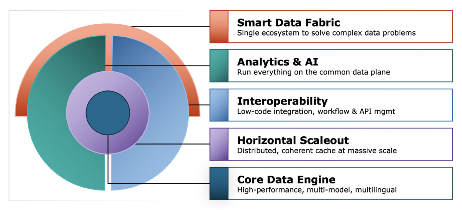 Ces couches (le moteur de données central, la couche ECP pour étendre l'interopérabilité et nos fonctionnalités d'analyse) font partie de notre capacité unique à alimenter une architecture de données intelligentes Smart Data Fabric. La structure de données est un modèle architectural qui fournit une gouvernance commune à une grande variété de données et de sources de données. Un modèle courant pour une structure de données consiste à importer des données provenant de plusieurs sources, à les normaliser, à les dédupliquer, à les corréler de manière croisée et à les améliorer, puis à les mettre à la disposition d'une variété d'applications différentes: