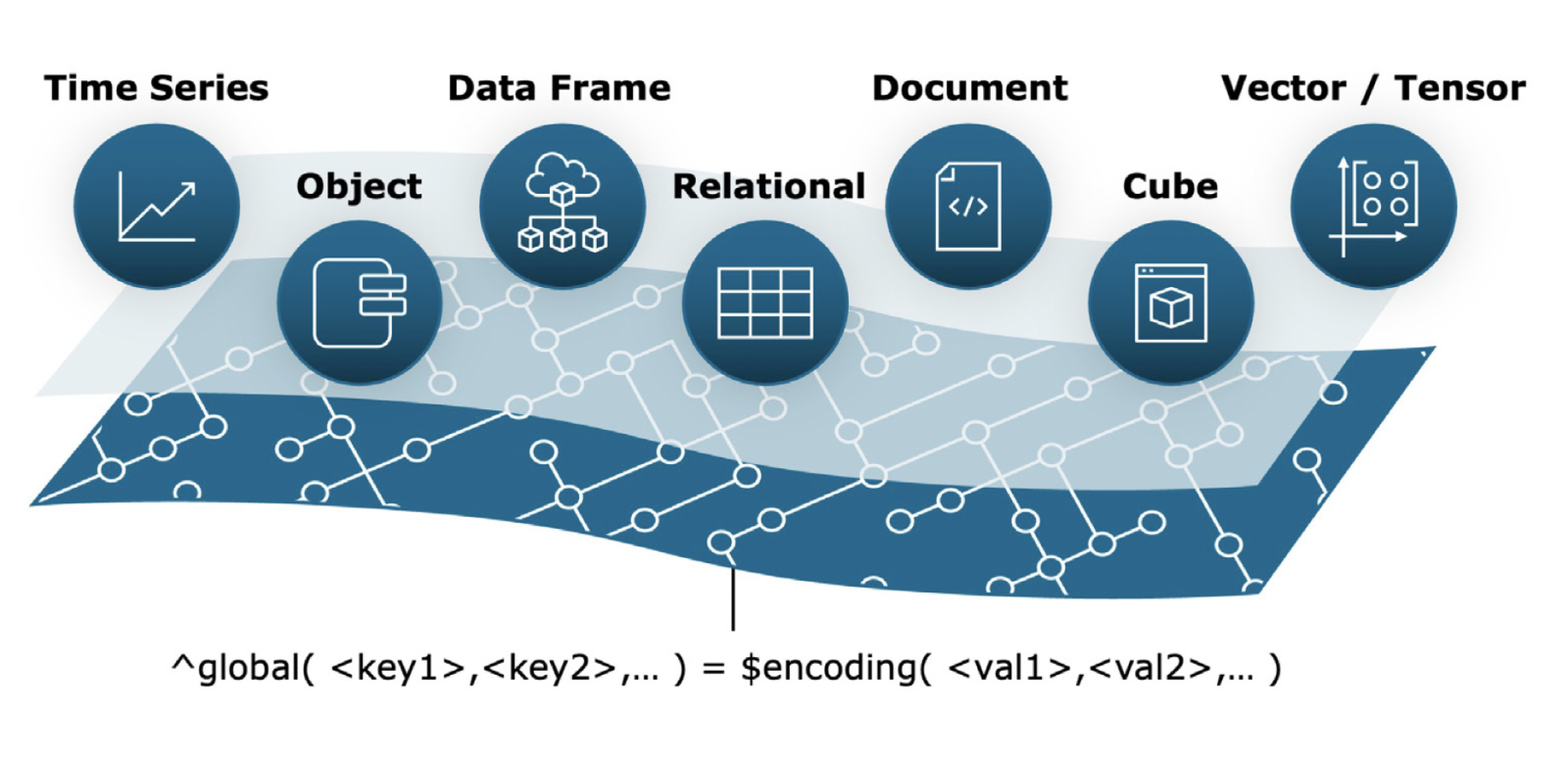 Réputée pour ses performances, la technologie InterSystems repose sur un mécanisme très efficace de stockage de données, d'indexation et d'accès aux données. Contrairement à d'autres fournisseurs de bases de données, nous ne fournissons pas de base de données nativement relationnelle ou documentaire. Nous utilisons un format de stockage sous-jacent appelé globales. Ils sont modélisés dans un format multidimensionnel hautement optimisé, sous forme de tableau, construit comme un arborescence B+ qui est automatiquement indexée à chaque operation.InterSystems.com Construit à un niveau inférieur aux modèles de données (tels que relationnel, objet ou document), un format de stockage unique est projeté dans différents formats et modèles de données. Ceci est appelé Common Data Plane ou plan de données commun.