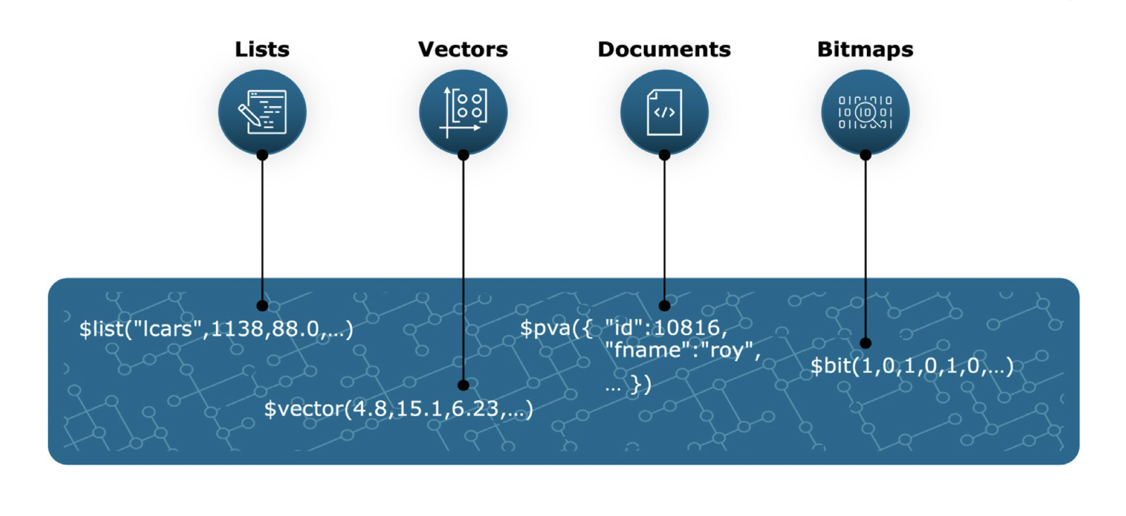 Bien que les listes constituent le codage de stockage par défaut, InterSystems IRIS peut représenter les données et les index dans un ou plusieurs de ces codages en fonction des caractéristiques des données et/ou des spécifications des développeurs. Les vecteurs permettent de stocker efficacement un grand nombre de données du même type et sont utilisés pour le stockage en colonnes dans les analyses, pour la recherche vectorielle, pour les séries temporelles et pour des cas plus spécialisés. Les tableaux de valeurs compactés (connus sous le nom de $pva) sont idéaux pour le stockage orienté document. Les bitmaps sont utilisés pour les données booléennes et pour les index bitmap très efficaces.