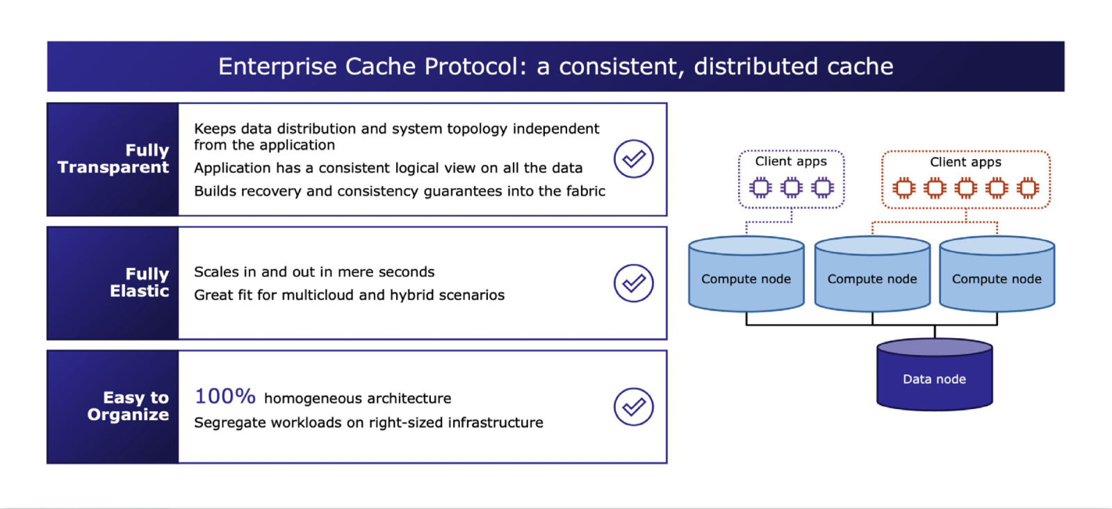 Autour du moteur de données central se trouve une mémoire cache distribuée offrant des garanties de cohérence intégrées. Ce cache utilise notre protocole Enterprise Cache Protocol, ou ECP, et répond aux garanties théoriques en matière de cohérence dans le cadre d'un système distribué et en cas de défaillance. L'ECP intègre ces règles de cohérence afin de préserver l'intégrité des données au sein d'un système distribué, même en cas de défaillance, en les encapsulant directement.
