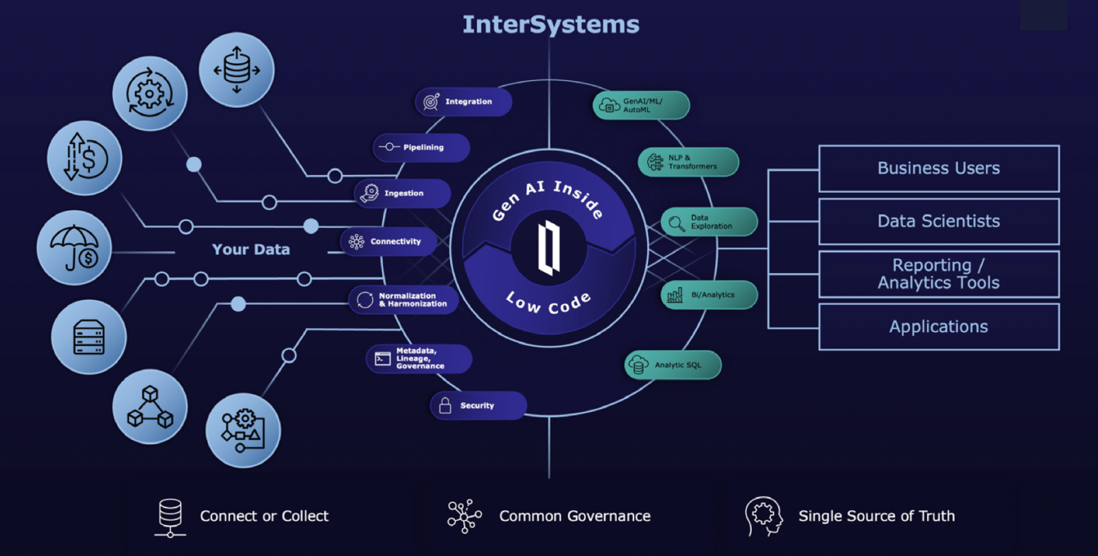 La plupart des structures de données offrent plusieurs fonctionnalités, notamment l'ingestion, le pipelining, les métadonnées, etc. L'approche d'InterSystems se distingue par l'intégration de l'analyse et de l'IA au cœur de la structure de données: