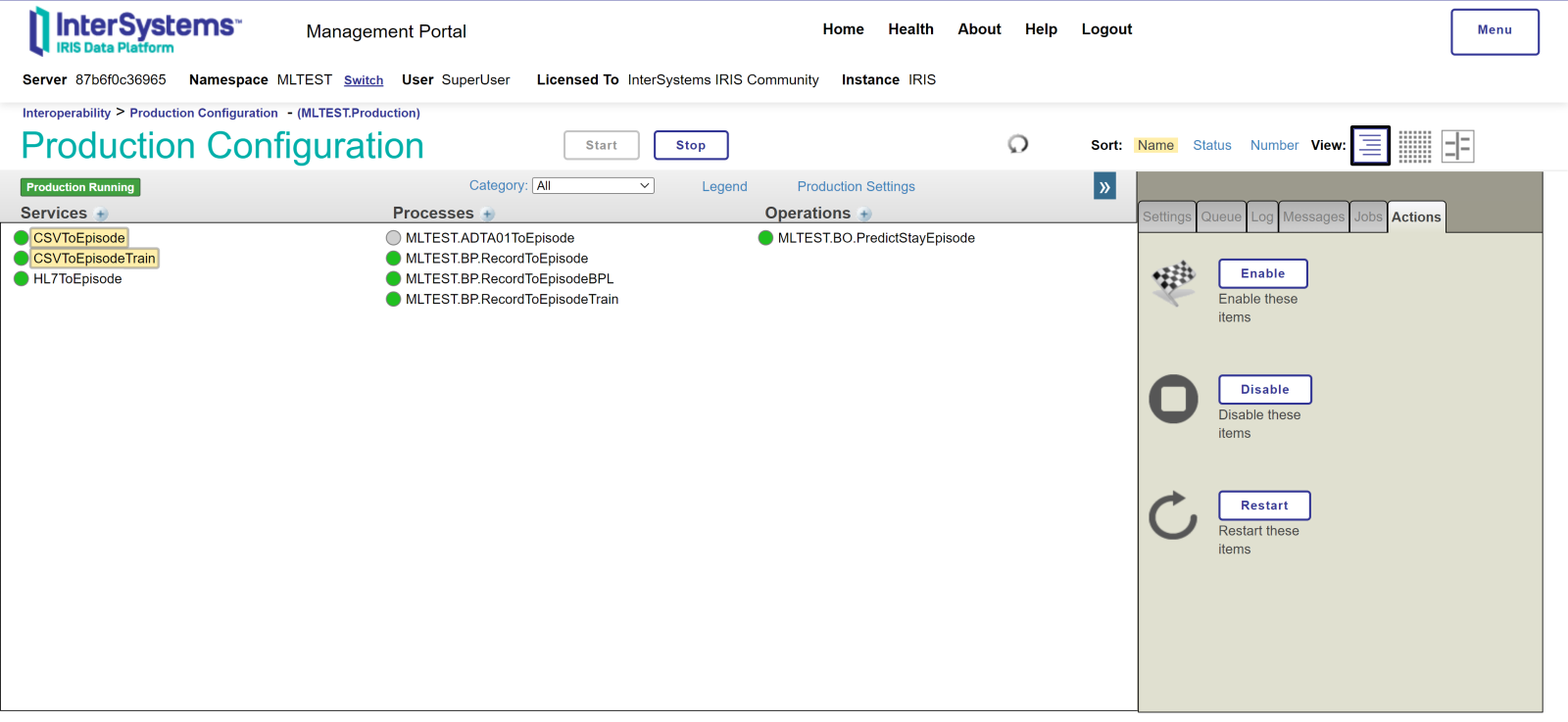 docker-compose up -dLors du lancement du conteneur, un espace de noms appelé MLTEST sera créé et une production sera lancée ; nous y trouverons tous les composants commerciaux nécessaires à l'ingestion de données brutes, à la création du modèle, à sa formation et à son implémentation ultérieure par le biais de la réception de la messagerie HL7.