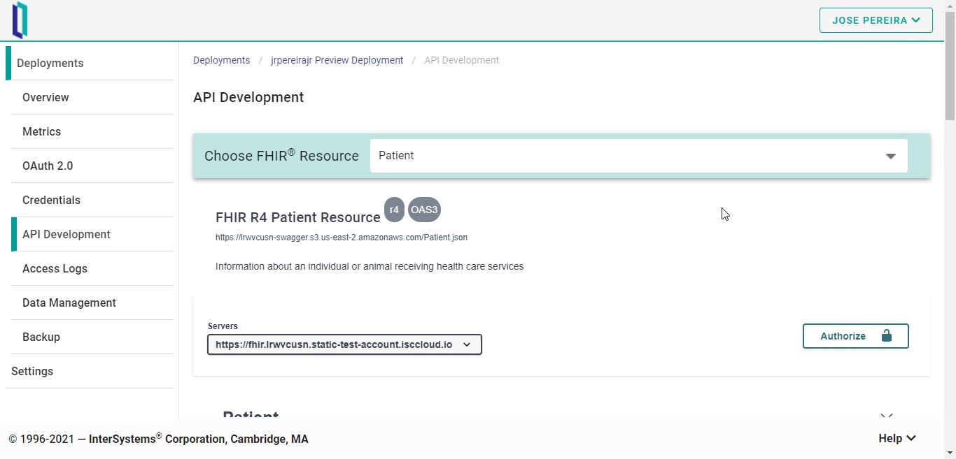 Pour y accéder, cliquez sur l'onglet "API Development". Après son chargement, vous pouvez sélectionner la ressource FHIR que vous souhaitez explorer. Notez que FHIRaaS fournit la version R4 pour les ressources FHIR.