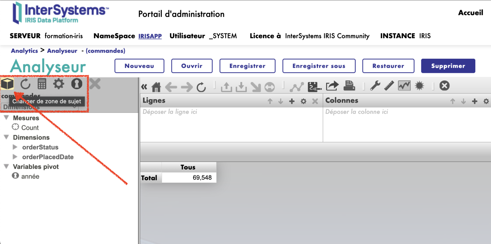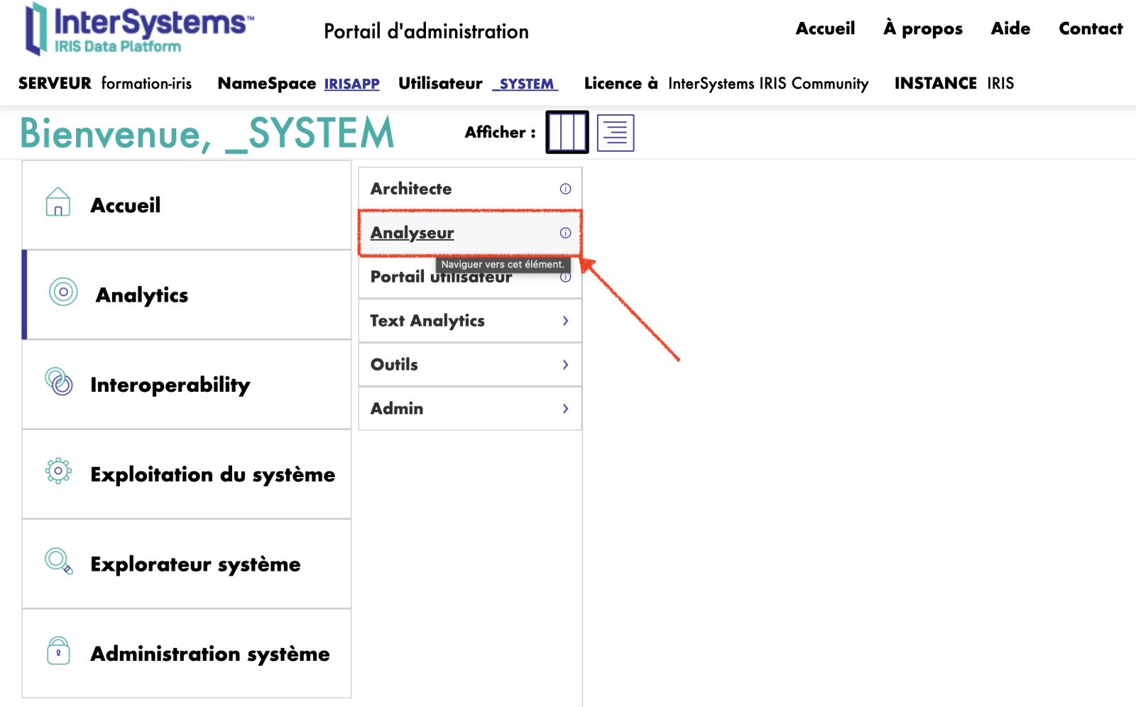 Pour commencer à travailler avec ANALYSEUR, accédez à la page du portail de gestion de la plateforme InterSystems IRIS. Ensuite, sélectionnez l'onglet Analytics, puis accédez à la section Analyseur. Cette étape permet aux utilisateurs d'accéder à un puissant outil d'analyse de données qui offre un large éventail de fonctionnalités pour l'exploration et la visualisation des données.