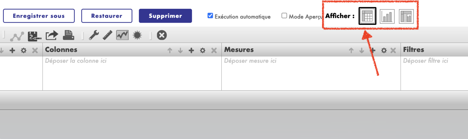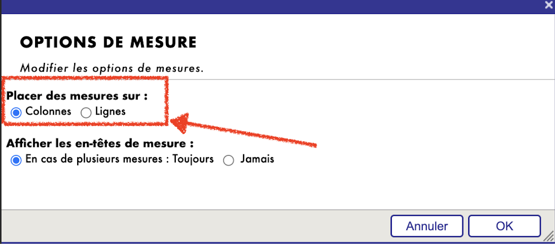 Placer des mesures sur: Cette option vous permet de déterminer dans quelle zone (colonnes ou lignes) placer les mesures pour faciliter la comparaison et l'analyse des données.