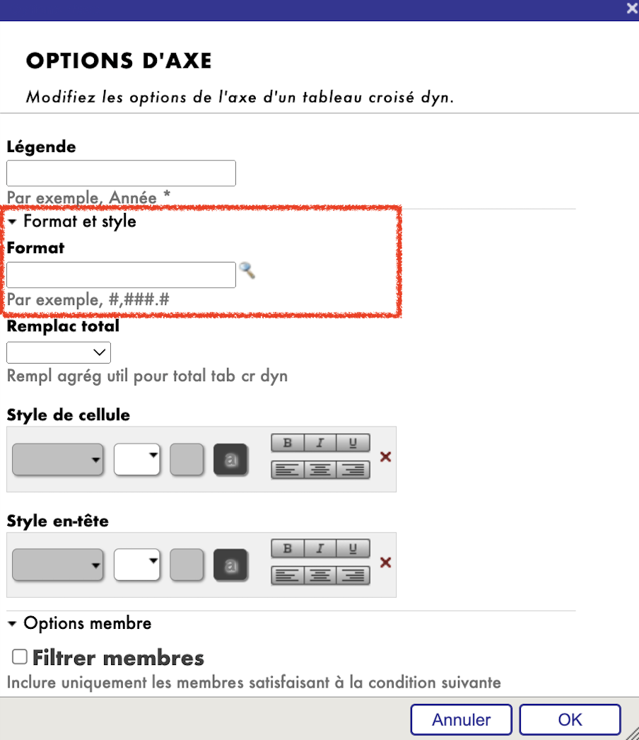 Format: Cette option vous permet de personnaliser le formatage et les styles d'affichage des données dans les axes Lignes et Colonnes pour une présentation plus pratique et informative.
