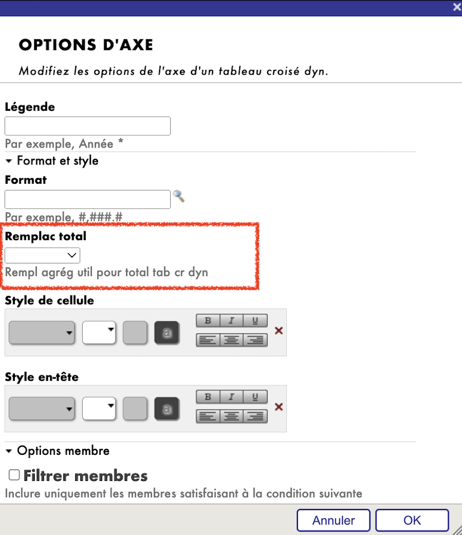 Remplacement Total: Ce paramètre permet de remplacer l'agrégation utilisée pour totaliser les données dans les axes "Lignes" et "Colonnes".