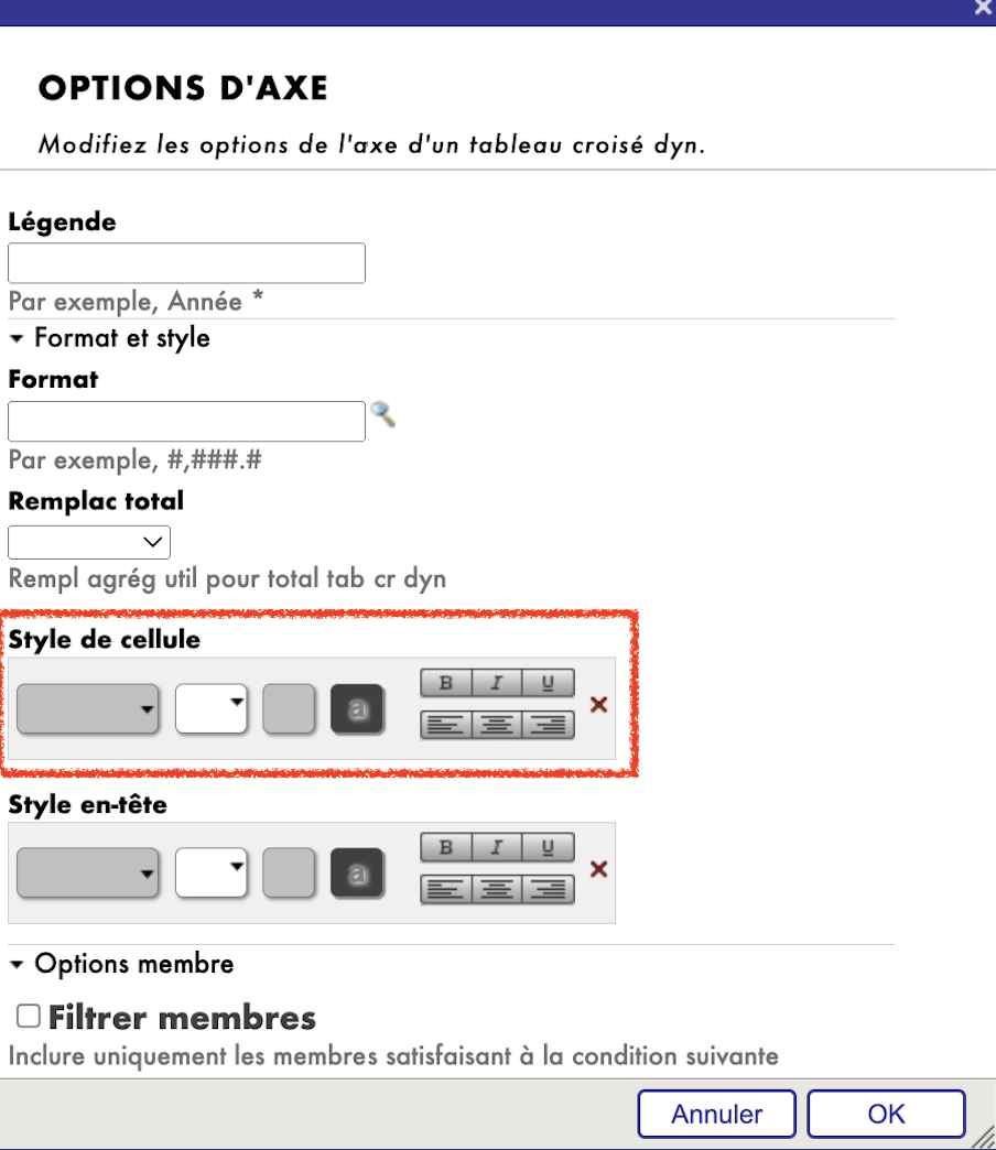 Style de cellules: Ce paramètre vous autorise à modifier le style de cellule des données affichées dans les axes Lignes et Colonnes pour une meilleure visualisation.