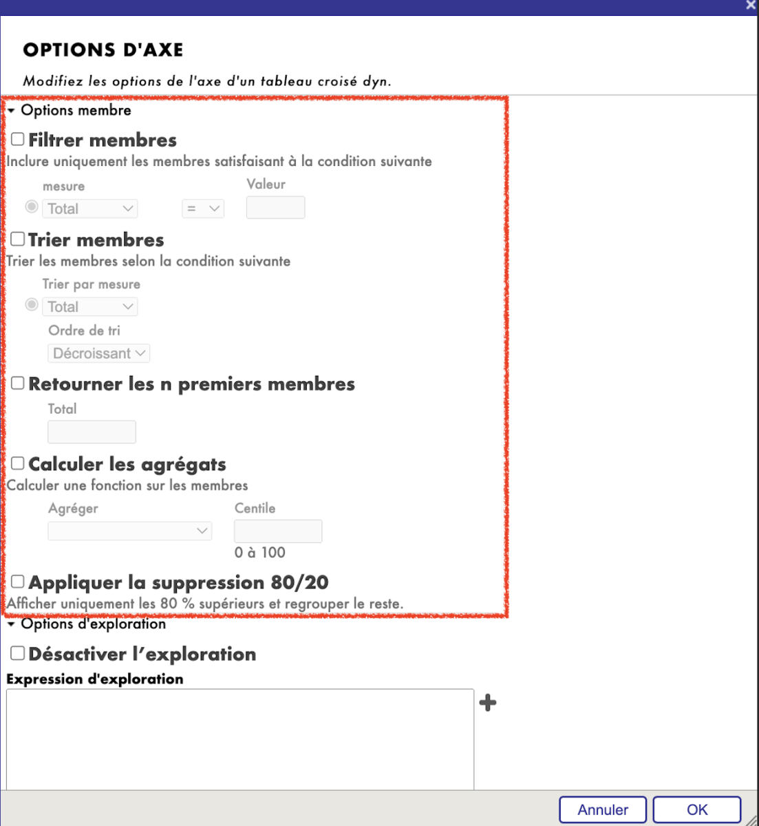 Dans ANALYSEUR, vous pouvez personnaliser les paramètres des éléments "Lignes" et "Colonnes" à l'aide de la fonction "OPTIONS AXES". Découvrez ci-dessous les paramètres disponibles pour ajuster les axes « Lignes » et « Colonnes » :