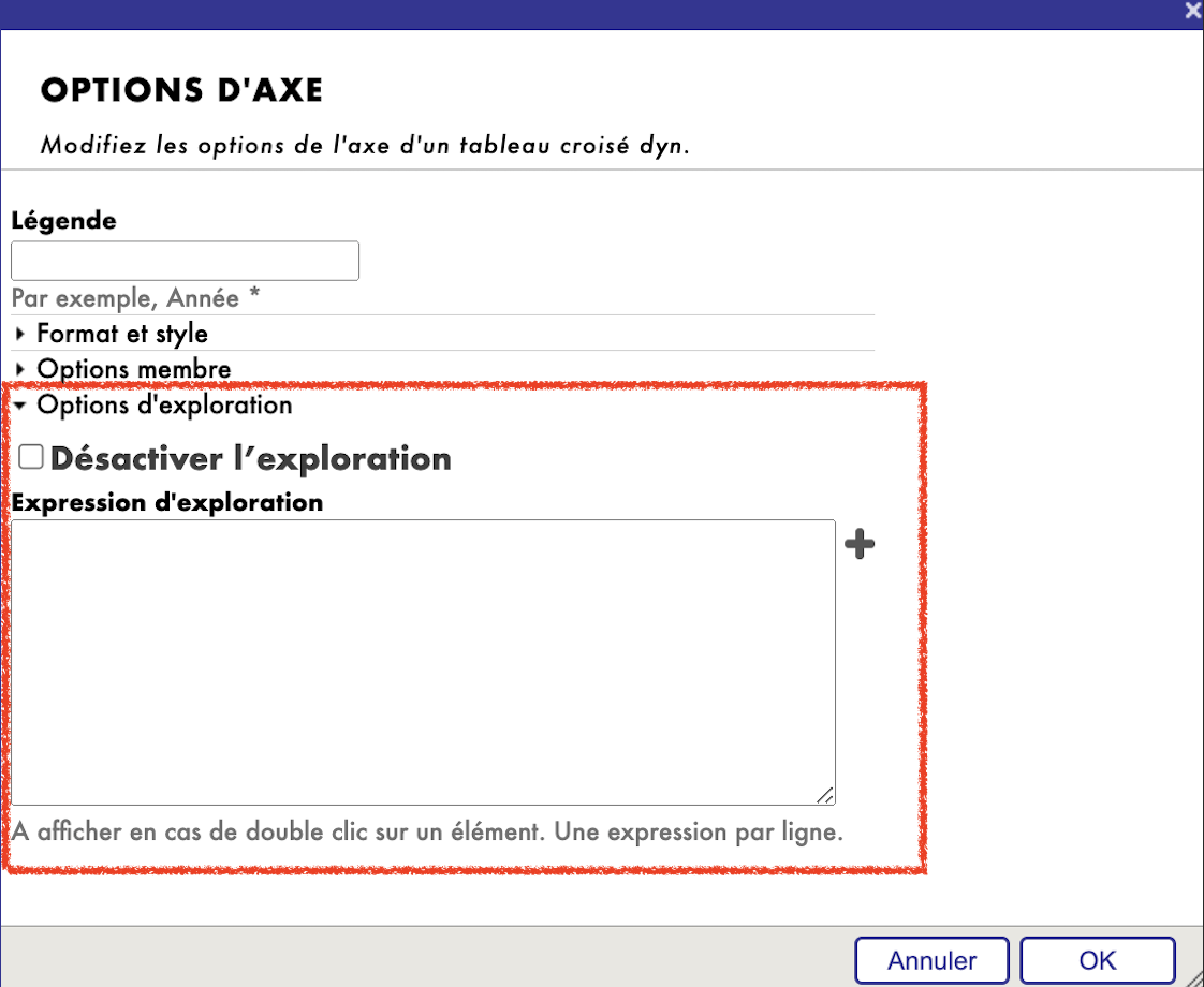 Légende: Cette option vous permet de définir une légende pour les axes Lignes et Colonnes pour une identification plus précise et détaillée des données qui y sont présentées.