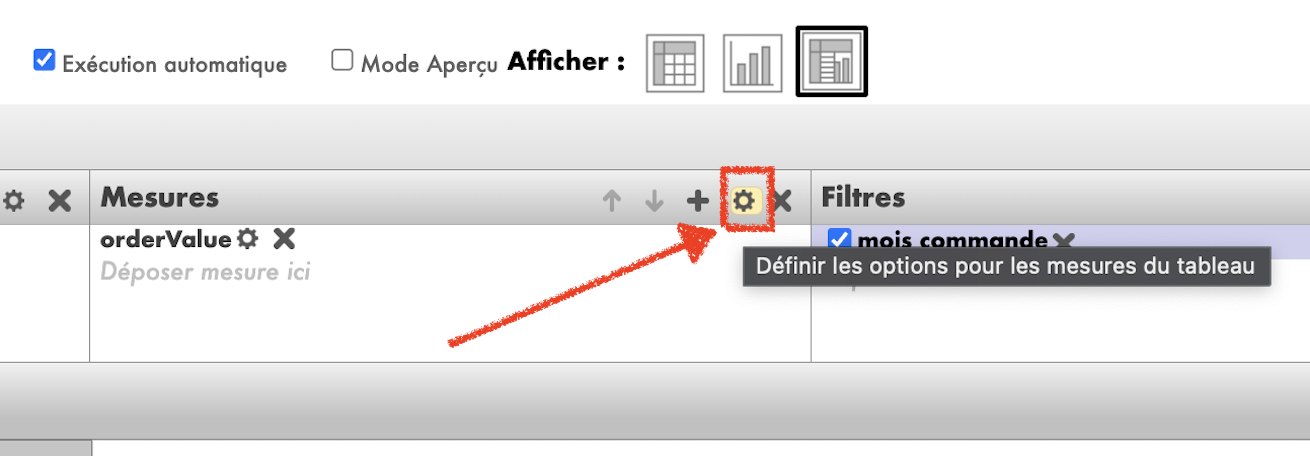 Mesures: Cet élément permet aux utilisateurs d'ajouter des indicateurs ou des mesures spécifiques au tableau récapitulatif pour évaluer les performances ou les résultats. Les utilisateurs peuvent sélectionner différents types de mesures, notamment des sommes, des moyennes, des médianes et autres, pour une analyse plus approfondie des données.