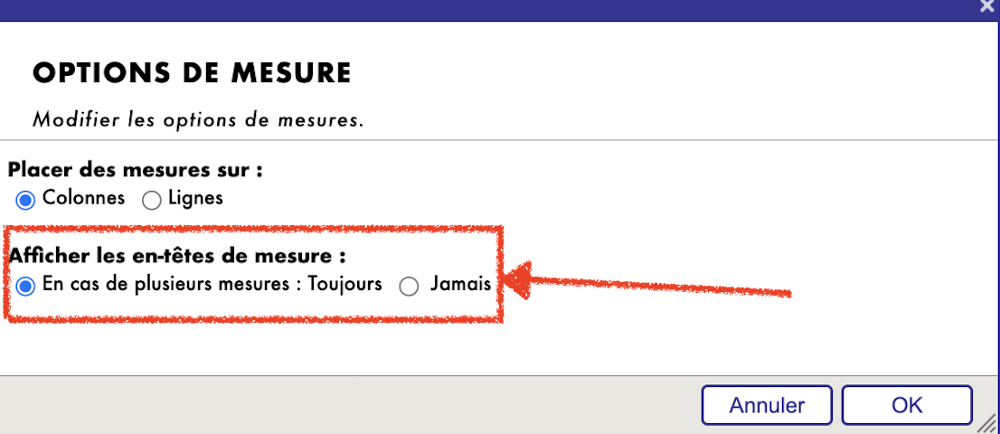 Afficher les en-têtes de mesure: Cette option permet de contrôler l'affichage des en-têtes de mesures dans le tableau récapitulatif en fonction du nombre de mesures sélectionnées. Vous pouvez décider quand et comment afficher ces en-têtes pour améliorer la visualisation des données.