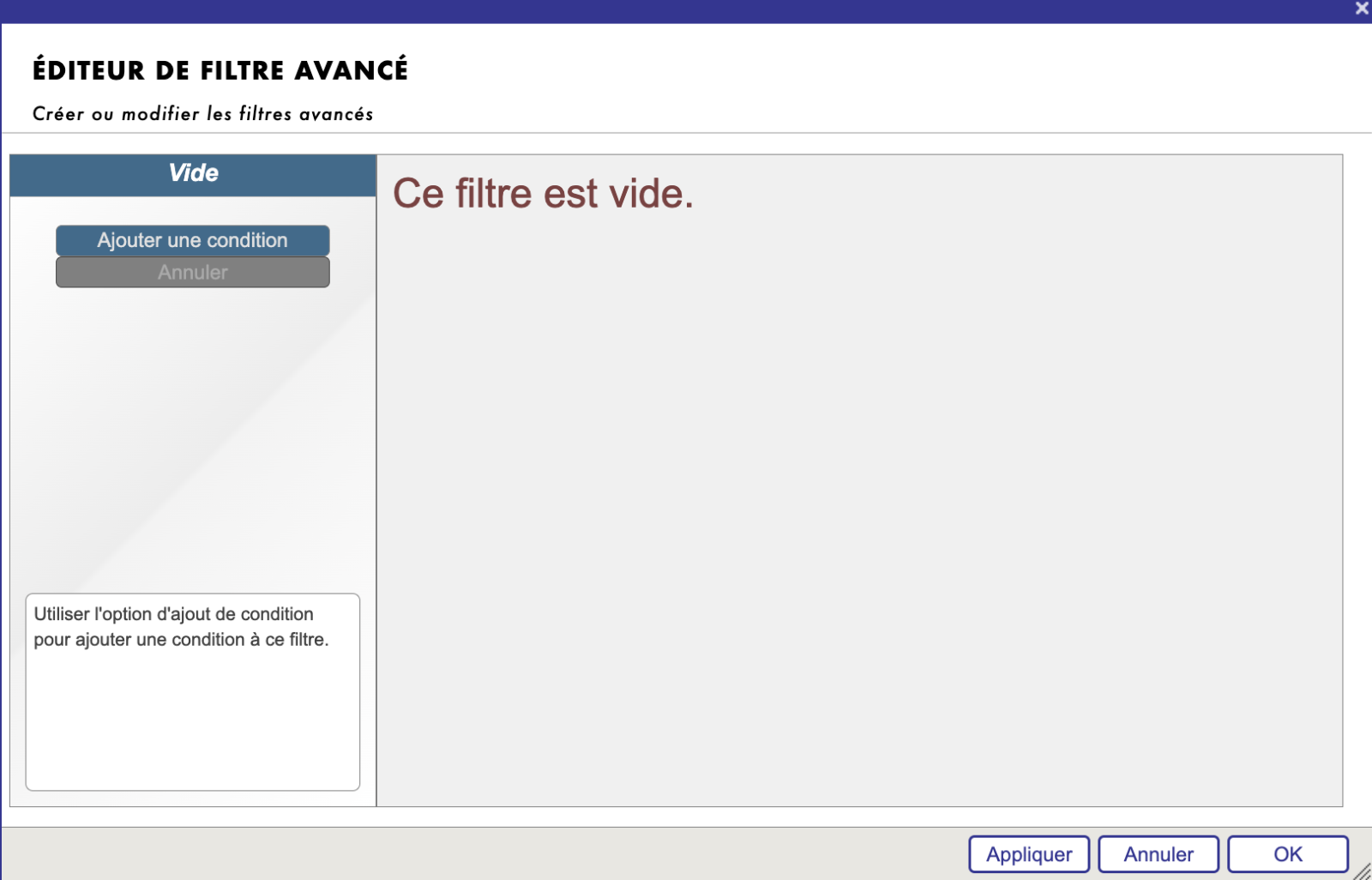 Vide: Si le filtre est vide, vous pouvez utiliser la fonction « Ajouter une condition » pour ajouter des prérequis pour filtrer les données. Il en résultera un filtrage plus authentique et approfondi pour obtenir les résultats souhaités.