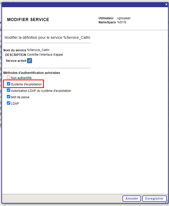 %Service.Callin était activé cependant comme pour faire fonctionner le terminal IRIS, il fallait cocher la case Système d'exploitation, et en effet ça marche mieux maintenant.
