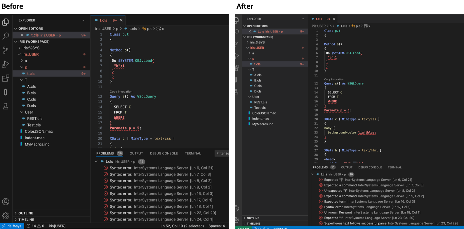Dans le passé, toutes les erreurs de syntaxe étaient signalées simplement comme "Erreur de syntaxe". Désormais, l'erreur de syntaxe signalée dans le volet PROBLEMES de VS Code contient les mêmes détails que vous trouvez lors de la compilation dans le terminal, vous aidant ainsi à identifier et à résoudre plus rapidement les problèmes dans votre code. Dans la capture d'écran ci-dessous, j'ai plusieurs erreurs dans mon code ObjectScript. À gauche, sous Avant, le serveur de langue signalerait uniquement « Erreur de syntaxe ». Désormais, sous Après, vous constaterez que le serveur de langue est capable de fournir des descriptions d'erreurs beaucoup plus utiles dans le volet PROBLEMES. Et n'oubliez pas que tout cela se produit au fur et à mesure que vous tapez, avant la compilation. C'est donc une bonne idée de garder ce volet visible si vous bénéficiez souvent de ce genre d'aide.