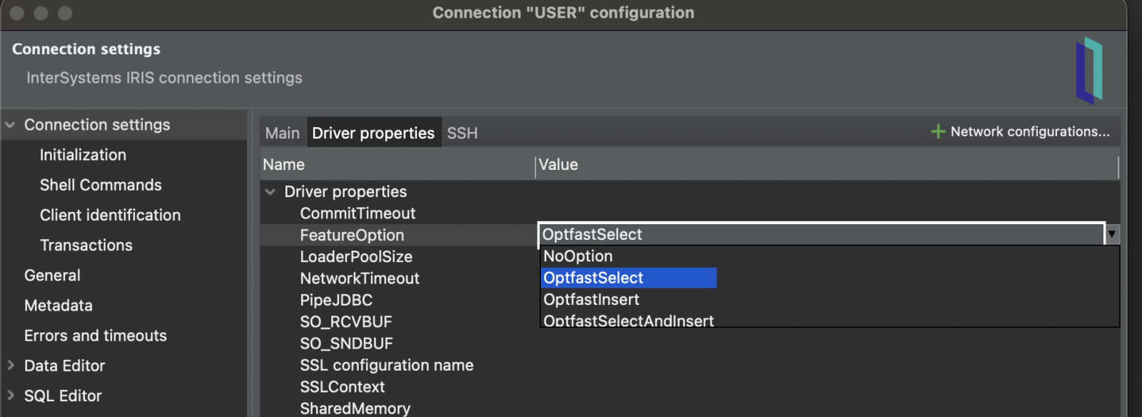 Dans DBeaver, sélectionnez optfastSelect dans le champ FeatureOption.