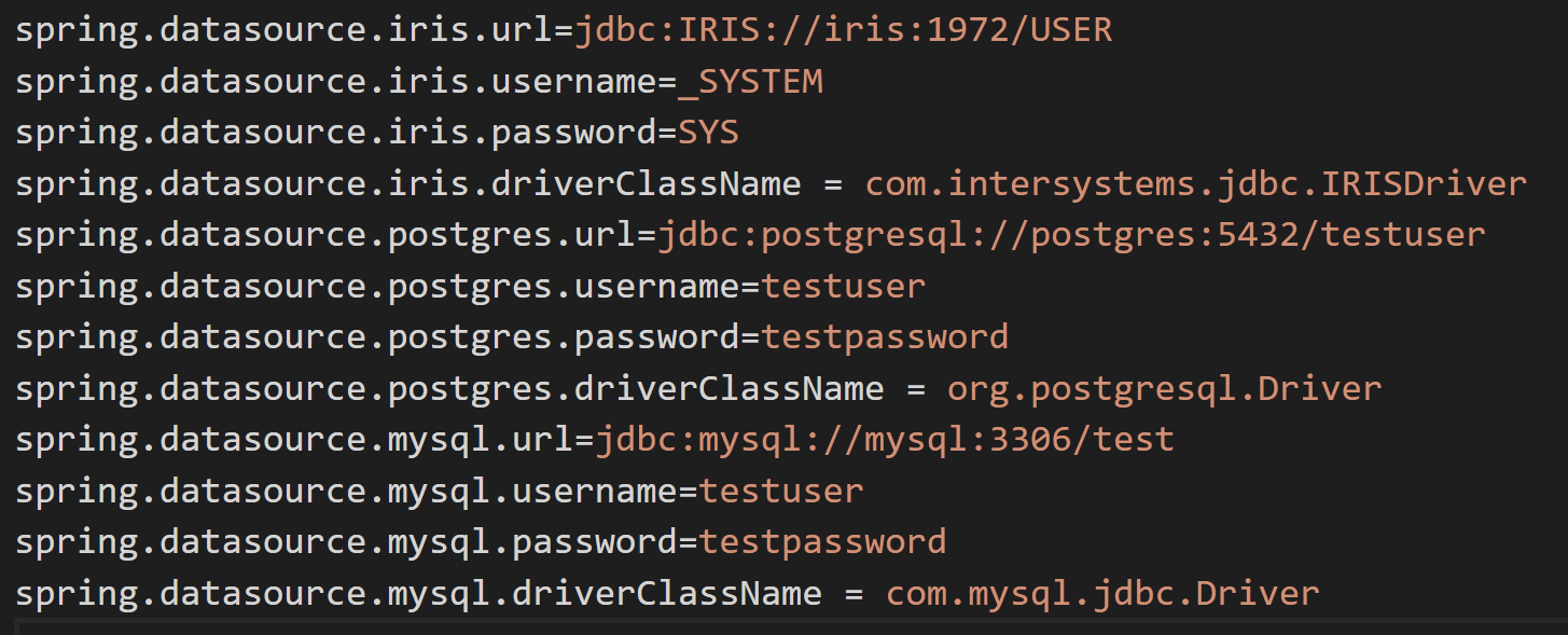 En tant qu'ancien développeur de JAVA, j'ai toujours eu du mal à décider quelle base de données était la plus appropriée pour le projet à développer. L'un des principaux critères que j'utilisais était la performance, ainsi que les capacités de configuration de HA (haute disponibilité). Eh bien, il est maintenant temps de mettre IRIS à l'épreuve en ce qui concerne certaines bases de données les plus couramment utilisées, j'ai donc décidé de créer un petit projet Java basé sur SpringBoot qui se connecte via JDBC avec une base de données MySQL, avec une autre base de données PostgreSQL et enfin avec une base de données IRIS.