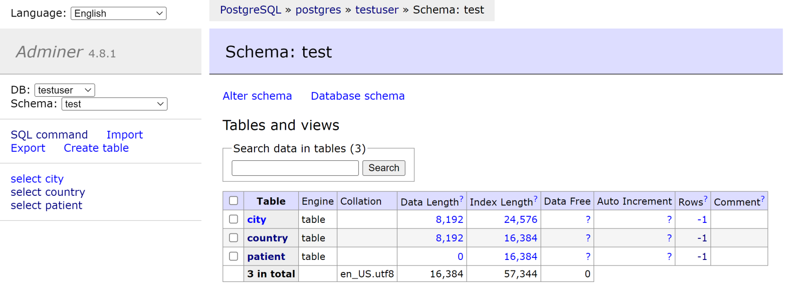 Sélectionnons la base de données testuser et le schéma test: