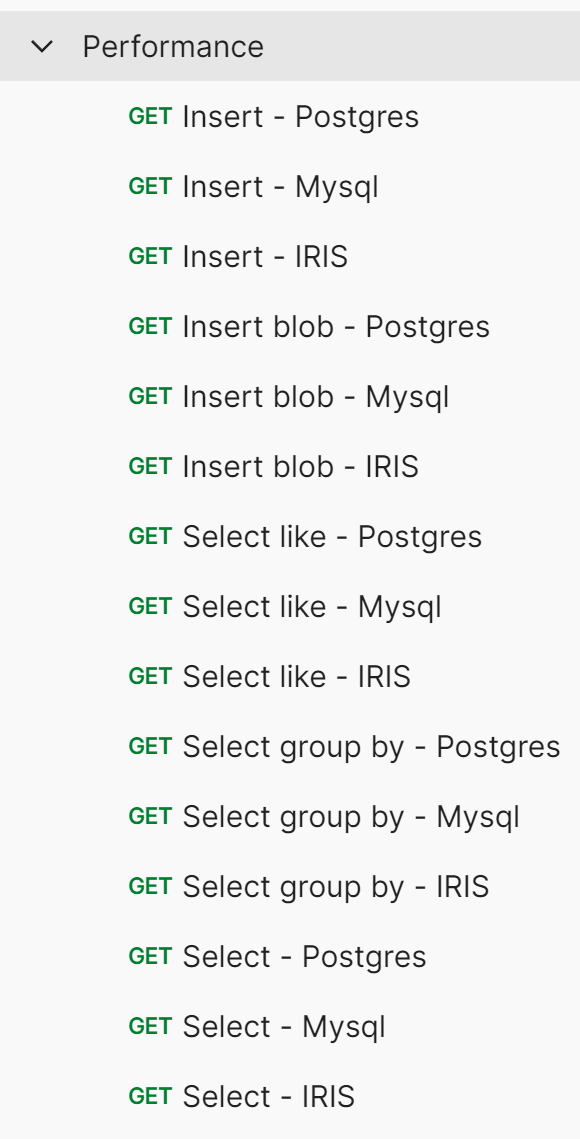 Appel REST: GET http://localhost:8080/performance/tests/selectGroupBy/{database}