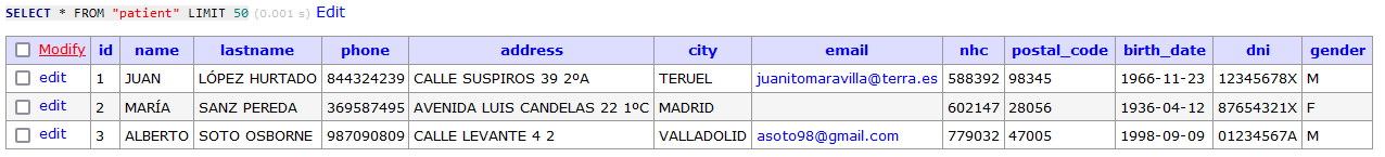 Set tSC = $$$OKset sql="SELECT id, name, lastname, phone, address, city, email, nhc, postal_code, birth_date, dni, gender FROM his.patient WHERE id = ?"//perform the Selectset tSC = ..Adapter.ExecuteQuery(.resultSet, sql, patientId)