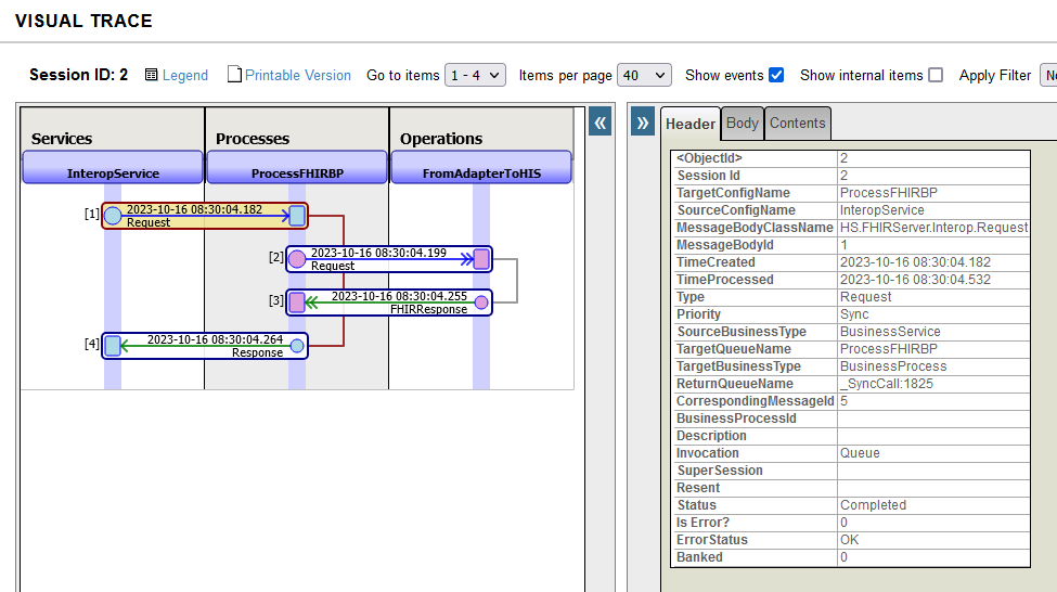 Comme vous pouvez le voir, cette méthode ne fait que lancer une requête dans la base de données de notre HIS et récupérer toutes les informations du patient, puis générer un DynamicObject qui est par la suite transformé en une Chaîne et stocké dans une variable de type Adapter.Message.FHIRResponse. Nous avons défini la propriété Ressource comme une liste de chaînes pour pouvoir afficher la réponse plus tard dans la trace. Vous pourriez la définir directement en tant que DynamicObjects, en évitant les transformations ultérieures.
