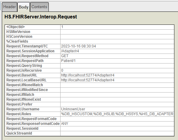 • Quick.StreamId: L'adaptateur FHIR Adapter transformera chaque message FHIR reçu en un flux et lui attribuera un identifiant qui sera sauvegardé dans cet attribut. Pour cet exemple, il n'est pas nécessaire puisque nous effectuons un GET et que nous n'envoyons pas d'objet FHIR.
