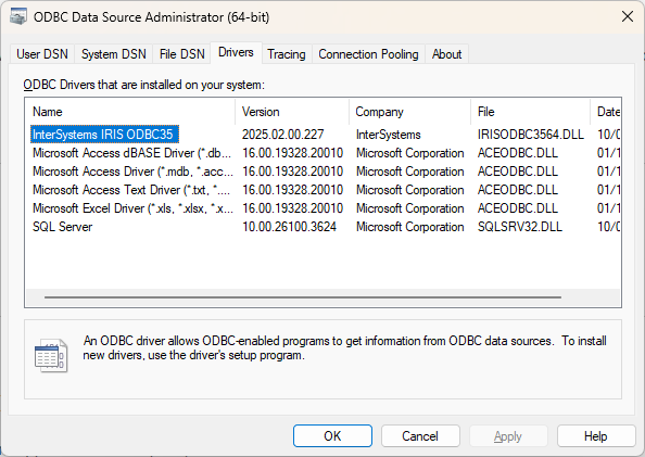 Une fois installé, vous pouvez vérifier sa présence dans l’outil Administrateur de sources de données ODBC sous Windows (recherchez le pilote InterSystems IRIS ODBC35).